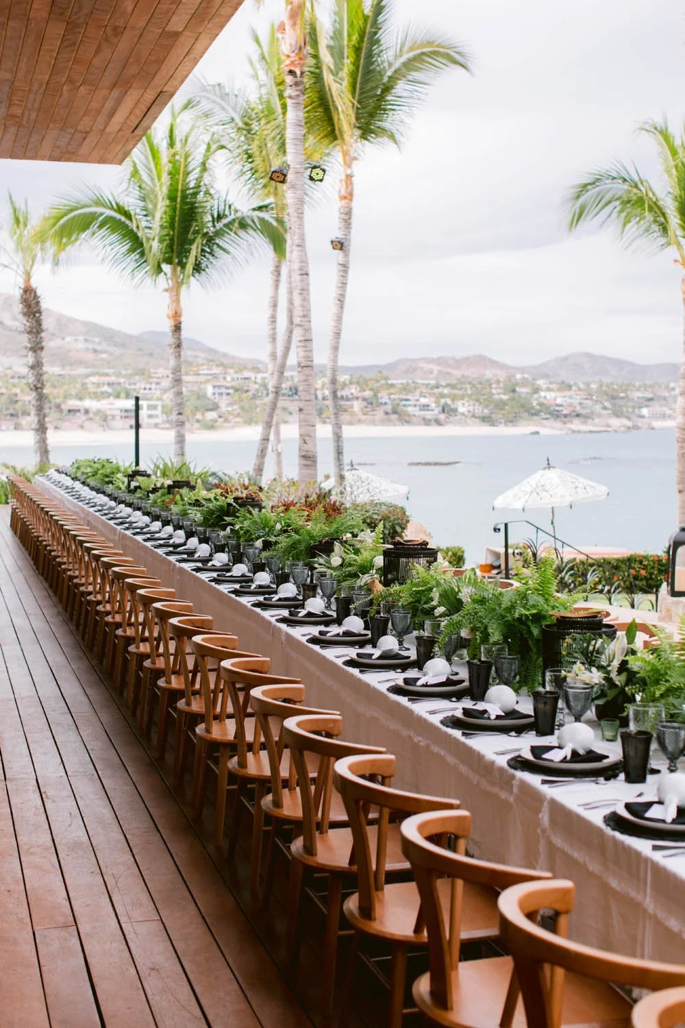 This intimate rehearsal dinner may have captured all the senses—the soft ocean breezes, the scent of bougainvillea, the clink of crystal, the raucous laughter of a good roast, and the tang of exquisite Mexican cuisine all played supporting roles. For us though, the star was the axial view . . . a neverending table clad in frayed-edge white linen and topped with moody moments of velvety black and rich green led the eye from one end of the restaurant deck out almost to the sea.
