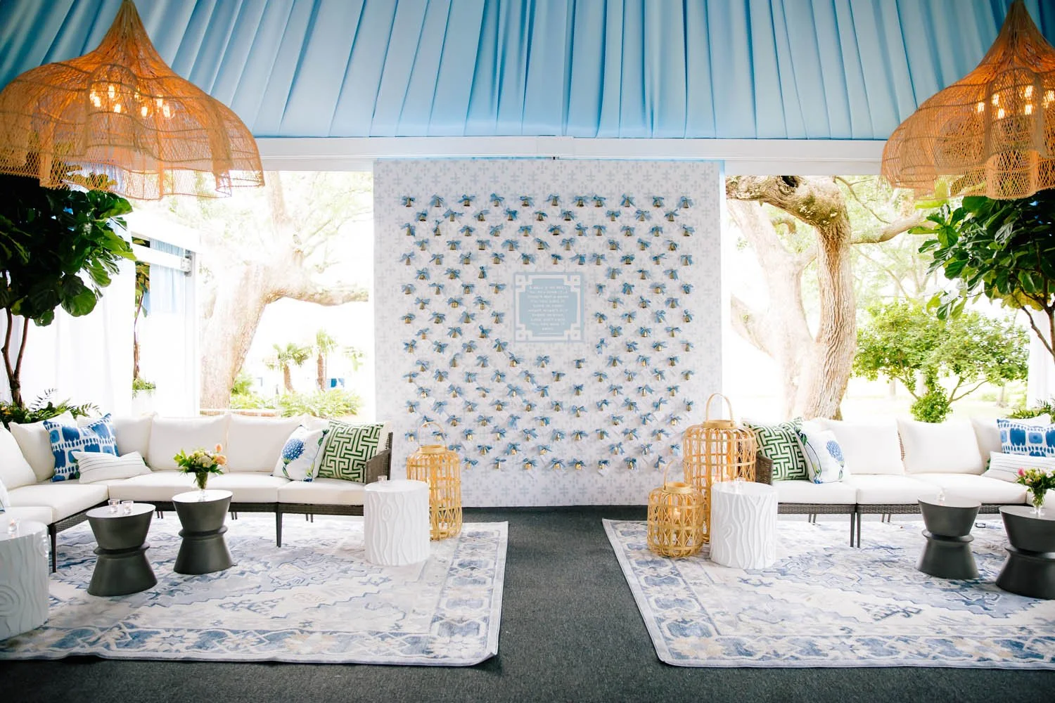 Lacey and Bryan’s guests snagged wedding bells tagged with escort cards and rung them all the way to a 9,600 square-foot sailcloth dinner tent that offered the unique opportunity to create a massive impact with available real estate—namely, the flooring. We skipped the expected sisal or seagrass for eye-catching custom carpet in the couple’s palette of blues and creams. Nicknamed “Dottie”, its speckled presence informed the tablescapes and drama of the entire dinner look, providing a patterned slate on which white-on-white seersucker linens could rest quietly.